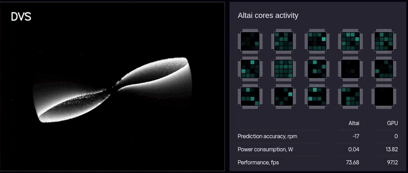 The event-driven principle of neuromorphic computing in the sensor–chip–neural network chain is clearly illustrated by the activity of the cores within the AltAI chip when the SNN processes the data from the DVS camera (see the figure below). The cores are only active when there are changes in the monitoring scene (the fan blades are rotating). Moreover, only the local areas of the network (neuromorphic cores) currently involved in the processing are active.
